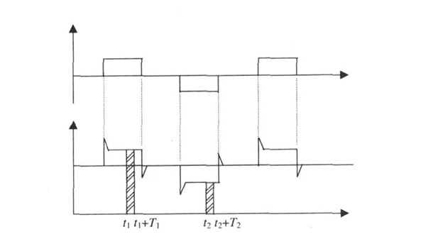 硫酸流量計一般都采用工頻交流電源供電, 其電源電壓的幅值和頻率的變化都會給硫酸流量計帶來電源性干擾噪聲。對電源電壓的幅值變化, 因采用多級集成穩壓, 一般而言電源電壓的幅值變化對電磁流量的測量精度影響不大。當電源電壓的頻率波動時, 雖然其波動范圍有限, 但對硫酸流量計測量精度影響較大。為了解決工頻干擾問題, 實現對流體流速感應電勢eab信號的準確測量, 需利用以下基本關系:①勵磁周期為工頻周期的整數倍, 即勵磁頻率為50/nHz(n為偶數);②正負勵磁下的同相位采樣。圖2是對應低頻矩形波勵磁形式下的典型電勢信號形式, 按上述關系在一個勵磁周期下, 若假設t1 和t2 點為工頻干擾的等效干擾點, 且采樣寬度T=T1 =T2 , 則eab的基本算式為: