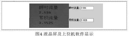 該程序主要用于實(shí)時更新流量信息,微處理器與上位機(jī)通過RS232接口以modbus協(xié)議進(jìn)行通信。*后,該設(shè)計(jì)液晶屏上所顯示的流量信息與上位機(jī)軟件所顯示的數(shù)據(jù)如圖4所示。