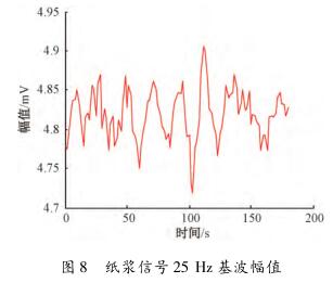在頻域中對(duì)紙漿信號(hào)觀察時(shí)發(fā)現(xiàn),紙漿信號(hào)的漿液噪聲頻帶在零頻率點(diǎn)附近,距離流量信號(hào)基波頻率點(diǎn)較遠(yuǎn),對(duì)基波幅值和各奇次諧波幅值基本沒(méi)有影響,紙漿信號(hào)在頻域中的圖形如圖7所示。選擇一組采集的紙漿信號(hào),把其等分成數(shù)段,利用MATLAB計(jì)算每段數(shù)據(jù)在基波處的幅值并提取保存在一個(gè)數(shù)組中,使用繪圖工具畫(huà)出來(lái),如圖8所示。可見(jiàn),基波幅值在4.7~4.95mV變化,波動(dòng)較小。因此,提取到的與流量相關(guān)的感應(yīng)電動(dòng)勢(shì)信號(hào)幅值會(huì)比較穩(wěn)定。