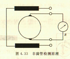 非滿管檢測也是基于電導(dǎo)率檢側(cè)的方法。在圖4.33所示的電磁流量傳感器中,增加了一個(gè)(或一對(duì))非滿管檢測電極。當(dāng)導(dǎo)管內(nèi)液體滿管時(shí),頂部電極與其他電極之間的電阻值很小;而當(dāng)存在非滿管情況時(shí),頂部電極與導(dǎo)電液體之間有氣體阻隔,所以電極電阻顯著增大,從而做出非滿管判斷。