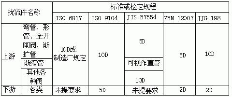 為獲得正常測量精確度,電磁流量傳感器上游也要有一定長度直管段,但其長度與大部分其它流量儀表相比要求較低。90°彎管、T形管、同心異徑管、全開閘閥后通常認為只要離電極中心線(不是傳感器進口端連接面)5倍直徑(5D)長度的直管段,不同開度的閥則需10D;下游直管段為(2~3)D或無要求;但要防止蝶閥閥片伸入到傳感器測量管內。各標準或檢定規程所提出上下游直管段長度亦不一致,匯集如表1所示,要求比通常要求高,這是由于為保證達到當前0.5級精度儀表的要求。表1