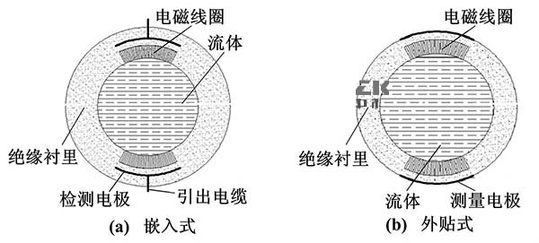電極與被測流體通過絕緣管形成檢測電容,通過此電容來藕合流量信號。其主要的結構形式按照電極的安裝位置可以分為兩種:電極嵌人測量管的絕緣襯里內部(嵌人式)、電極貼在測量管外部(外貼式)。嵌入式結構與普通工業(yè)污水流量計結構相似,而外貼式大多是通過陶瓷表面金屬化技術將電極貼在測量管外。