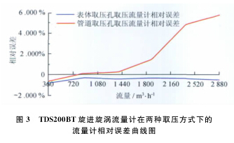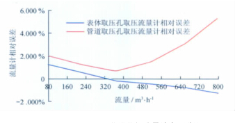 從以上數據表和曲線圖中可以看出:天燃氣流量計型號一定的情況下,用表體取壓孔取壓方式檢定流量計時流量計的線性度較好,用管道取壓孔取壓方式檢定流量計時流量計的線性度較差;流量測點相同的情況下,表體取壓孔取壓檢定方式的流量計誤差較小,管道取壓孔取壓檢定方式的流量計誤差較大;兩種取壓方式引起的誤差隨著流量的增大而逐漸增大,在流量為2 900m3/h時兩者相差近6.2%,遠遠超出了流量計的準確度等級。所以,在天燃氣流量計的檢定過程中,應避免在流量計表體取壓孔以外的地方取壓進行檢定。