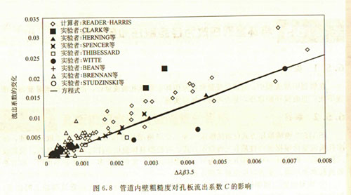 圖中所列的數(shù)據(jù)僅僅表明研究者對(duì)孔板做過這方面的研究,而不表明僅僅孔板有此影響。有的人吹噓說某種新型差壓裝置不像孔板那樣受雷諾數(shù)影響,不受管道內(nèi)壁粗糙度影響,那是不確切的。所有管壁取壓的差壓裝置都要受到雷諾數(shù)的影響和管壁粗糙度的影響。
