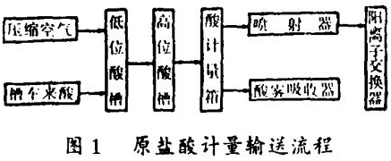 用陽離子交換樹脂制水要用酸作為再生劑。國內(nèi)電廠多選用鹽酸。鹽酸用傳統(tǒng)的箱式計量方法,使系統(tǒng)操作復(fù)雜,安全性能降低,還會嚴重污染環(huán)境。一種用智能電磁流量計代替鹽酸計量箱的負壓輸送鹽酸系統(tǒng)能克服上述缺點。該系統(tǒng)自運行以來,使用情況良好,維護方便,受到工人們的歡迎。