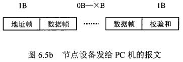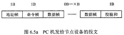 在飲用水流量計等節點設備和C機通信的過程中,由地址幀、命令幀、數據幀、校驗和可組成各種功能不同的報文。由于采用主從工作方式來實現通信,飲用水流量計等節點設備僅能接收并執行PC機發送來的控制命令,而不能發送命令給PC機。因此,由PC機發往流量計等節點設備的報文一般包括一個地址幀,一個命令幀,若干個數據幀和一個校驗和,其報文格式圖.6a5所示;而由流量計等節點設備發往PC機的報文一般包括一個地址幀,若干個數據幀和一個校驗和,其報文格式如圖6.5b所示。