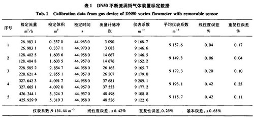 由表1和表2的實際標定數據可知,在量程比大于1:10的情況下,用不斷流氣體渦街流量計測量氣體或液體介質時,基本誤差及重復性均能達到中華人民共和國機械行業標準JB/T9249一1999《渦街流量傳感器》[’1中所規定的精度要求。