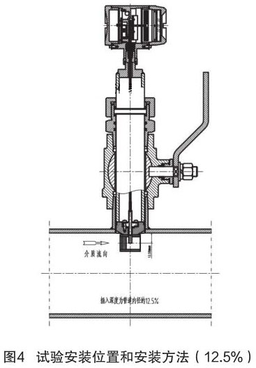 根據中華人民共和國機械行業標準:JB/T9249-2015《煙氣流量計》進行氣體渦輪流量計的研制與設計。在試驗過程中,因為理論研究不充分,再加上經驗不足,采用插入深度是按照以往其它產品(插入式電磁流量計)的經驗,以插入深度為現場管道內徑的 12.5% 進行試驗,其對介質流量的檢測值與同種規格管道法蘭式結構的煙氣流量計進行比較,偏差值較大、儀表準確度無法滿足設計要求。試驗安裝位置和安裝方法如圖 4 所示。