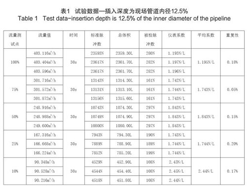 氣體渦輪流量計插入深度為現場管道內徑的 12.5%時,試驗數據如下(以 DN200 為例):