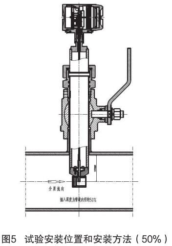 氣體渦輪流量計插入式電磁流量計的結構原理進行分析,插入式電磁流量計的信號采集點在標校管道內12.5% 為宜,因它屬電磁類流量計,而煙氣流量計是根據“卡門渦街”原理進行測量管道內流量,根據標校管道內層流和湍流的分析,以及氣體渦輪流量計獨特的探頭結構形式,確定氣體渦輪流量計的插入深度為標校管道內 50%,試驗安裝位置和安裝方法如圖 5 所示。