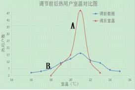 圖3中的曲線 A和B供熱管網(wǎng)渦街氣體流量計調(diào)節(jié)前后的熱用戶室溫變化情況,橫坐標表示室溫分布,縱坐標表示熱用戶數(shù)量。從圖中可以看出,渦街氣體流量計調(diào)節(jié)前熱用戶室溫比較分散,既有室溫小于18℃的熱用戶,也有室溫大于24℃的熱用戶。熱用戶室溫“近熱遠冷”,供熱管網(wǎng)存在水力不平衡現(xiàn)象。渦街氣體流量計調(diào)節(jié)后,有49戶用戶室溫在20℃~21℃之間,從圖中可以看出室溫分布范圍縮小,平均室溫降低,從而,不僅減少了供熱量,也大大提高了供熱品質(zhì)。一般來講,對采暖系統(tǒng),每增加 1℃平均室溫,能耗增多 5%~10%。采暖系統(tǒng)實現(xiàn)平衡后,常常可以降低平均室溫1℃~3℃。