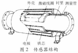 電磁流量計由流量傳感器和轉換器兩部分組成。傳感器典型結構示意如圖2,測量管上下裝有激磁線圈,通激磁電流后產生磁場穿過測量管,一對電極裝在測量管內壁與液體相接觸,引出感應電勢,送到轉換器。激磁電流則由轉換器提供。