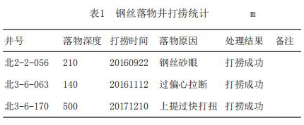 在大慶油田*三采油廠北3-6-P71井測試時,當儀器下至井下800m時,由于鋼絲有砂眼,800m鋼絲連同流量計一起掉井,該井球座深度為1200m。為此進行了落物打撈。*先使用兩片通井工具將井內鋼絲壓成一團。再使用旋轉式打撈矛下入井內,抓住落物完成打撈。使用旋轉式打撈矛打撈鋼絲落物時打撈矛應有一定的質量,要平穩操作、慢起慢下。
