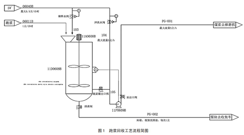 通過(guò)以上煤漿提濃通用方法優(yōu)缺點(diǎn)比較可以了解到,在現(xiàn)有設(shè)計(jì)條件基礎(chǔ)上,煤漿濃度提升會(huì)帶來(lái)一定設(shè)備損耗及能源損耗。針對(duì)這種情況,為了達(dá)到節(jié)能而保證管道蒸汽流量計(jì)不跑漿,對(duì)于磨機(jī)跑漿問(wèn)題進(jìn)行改善,對(duì)跑漿進(jìn)行回收,重新送回磨煤機(jī)進(jìn)行二次研磨,降低了管道蒸汽流量計(jì)入口原料煤的粒度;同時(shí)降低了人員勞動(dòng)強(qiáng)度,改善了現(xiàn)場(chǎng)衛(wèi)生情況。具體跑漿回收裝置設(shè)計(jì)流程如圖 1 所示。