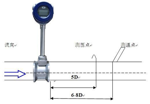 測壓孔和測溫孔的安裝設計。被測管道需要安裝溫度和壓力變送器時,測壓孔應設置在下游3-5D處,測溫孔應設置在下游6-8D處,見圖(七)。D為儀表公稱口徑,單位:mm