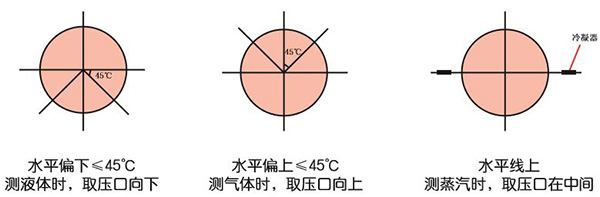 2、測氣體時,為防止液體進入導壓管,取壓口方向應處于水平線上偏45度的位置以內,正、負取壓口在同一水平面上。
