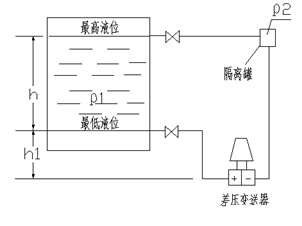 這時差壓變送器正壓室的壓力為:P+ = Hρ1+ h1ρ2+P0
