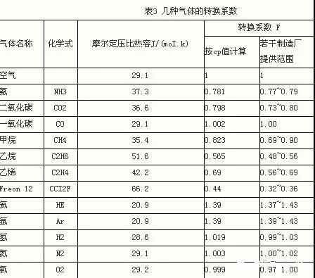 2) 不同氣體間流量換算 有些制造廠的使用說明書給出以空氣為基數(shù)的轉換系數(shù)f,可按式6換算;也可直接以標定(校準)氣體和實際使用氣體的摩爾定壓比熱按式6換算,但因還有熱導率等其他因素,換算后精度要降低些。表3給出若干氣體按摩爾定壓比熱容直接計算和若干制造廠提供的兩種轉換系數(shù)數(shù)據(jù),其中freon12兩者差別較大。