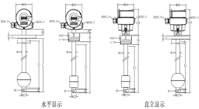 為更直觀地給用戶展現遠傳浮球液位計的規格,請參考兩種遠傳浮球液位計水平顯示以及直立顯示的不同規格尺寸,如下圖所示: