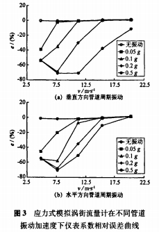 為了對比不同方向管道振動對渦街流量計測量的影響,將管道振動改為水平方向重新進行試驗,得到圖3(b)曲線。通過與圖3(a)比較,發現兩種情況下流速及振動加速度對儀表系數相對誤差的影響趨勢類似。依據先前擬定的抗振標準,應力式模擬