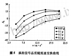 圖5給出了不同管道振動加速度下渦街信號品質隨流速變化的情況。不論振動加速度如何變換,Sq的變化趨勢都是隨著流速的增加而變大,但Sq何時由負變正,則與振動加速度密切相關。相同流速下,管道振動加速度越大,Sq值越小,渦街信號品質越差。Sq小于零時,表明由振動引起的其他頻帶能量大于渦街頻帶能量,且Sq絕對值越大,渦街信號品質越差,渦街流量計的測量誤差越大;Sq大于零時,表明渦街頻率帶的能量大于其它頻帶的能量,管道振動對渦街信號影響較小,且Sq值越大,渦街信號品質越好,渦街流量計的測量誤差越小。這也與圖3(a)得到的試驗結果完全吻合。