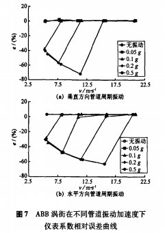 (1)管道振動加速度為0.05g、0.1g時,儀表系數相對誤差隨流速的升高而減小,*終減小至零;