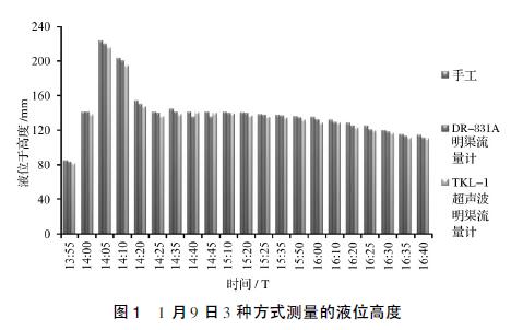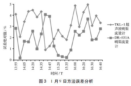 見圖3,以手工實測液位高度為基準,2種流量計的誤差均在±5%的范圍內。除在1月9日14:40和14:45兩個時間點測量值表現出DR-831A測量誤差高于TKL-Ⅰ外,其他時段都明顯表現出DR-831A測量誤差小于TKL-Ⅰ。