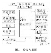 裝置采用模塊(裝置采用模塊(STM32F217STM32F217)來控制電磁流量)來控制化工污水流量計選型的工作,包括產(chǎn)生勵磁脈沖方波信號、接收從探頭計的工作,包括產(chǎn)生勵磁脈沖方波信號、接收從探頭送來的反映流量大小的微弱電信號、輸出送來的反映流量大小的微弱電信號、輸出4~20mA電流信號供指示儀表用,模塊附帶有各類接口電路電流信號供指示儀表用,模塊附帶有各類接口電路(RS232、高速USB接口等)。裝置包括:接口等)。裝置包括:IC1單片機、IC2前置放大器、IC3A/DIC3A/D轉換器、IC4電壓轉電流模塊、IC5勵磁線圈的驅動模磁線圈的驅動模塊電路、IC6電壓轉換模塊,以壓轉換模塊,以及USB快速接口電路、IC9芯片與周圍元件組片與周圍元件組成的RS232接口等電路。方框口等電路。方框圖如圖2所示。