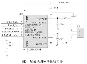 由于探頭尺寸較小,所產(chǎn)生的勵磁電流很弱,由于探頭尺寸較小,所產(chǎn)生的勵磁電流很弱,要處理這樣的信號,則后續(xù)的放大電路要有足夠高要處理這樣的信號,則后續(xù)的放大電路要有足夠高的輸入阻抗和較大的增益,來保證傳感器的靈敏度的輸入阻抗和較大的增益,來保證傳感器的靈敏度及抗干擾性;為了防止交流及抗干擾性;為了防止交流50Hz的工頻干擾,選的工頻干擾,選用方波電流作為勵磁電流,其頻率選用用方波電流作為勵磁電流,其頻率選用12.5Hz,它是1/4的工頻頻率,這樣可有效地抑制工頻干擾。勵磁信號在單片機內(nèi)部生成,從*勵磁信號在單片機內(nèi)部生成,從*26腳輸出12.5Hz方波信號,接到勵磁線圈的驅動模塊電路方波信號,接到勵磁線圈的驅動模塊電路IC5(LMD18200T LMD18200T)的3腳信號,它的內(nèi)部采用腳信號,它的內(nèi)部采用H橋式驅動,送出勵磁電流加到其橋式驅動,送出勵磁電流加到其2腳和10腳之間的勵磁線圈上。在勵磁線圈L上形成20~30mA方波電流,它與控制方波電壓同步。使流體運動切割波電流,它與控制方波電壓同步。使流體運動切割磁力線產(chǎn)生的方波電壓與勵磁電流完全保持同步, 磁力線產(chǎn)生的方波電壓與勵磁電流完全保持同步,這樣也便于在接收放大電路中信號的同步解調(diào)。電路如圖3所示。